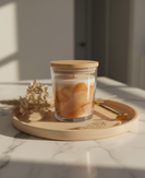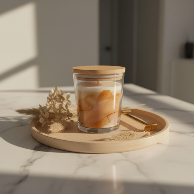 You get a unique marbled design that creates a one-of-a-kind pattern in every candle, diffusing light beautifully as it burns. A natural bamboo lid completes the look, blending sustainability with modern, boho-chic style.