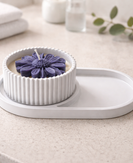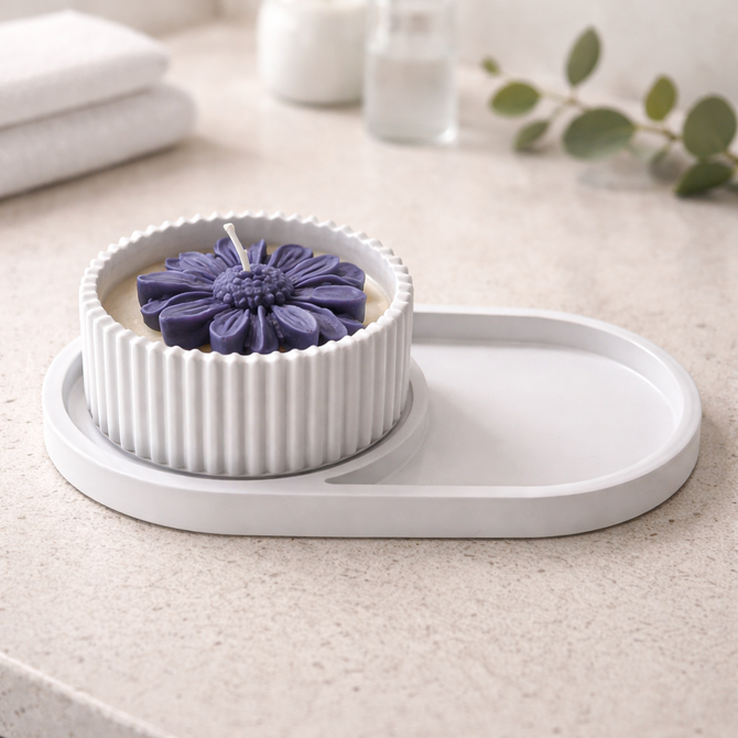 Poured into a ribbed, handcrafted vessel and paired with a matching tray, this piece brings structure and softness together. The fluted edges catch light subtly, while the low, grounded shape gives it a quiet presence on any surface.
