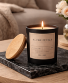 Poured into a frosted glass vessel with a subtle marbled glow, Suede Petals comes alive when lit, casting a soft, ambient light that instantly calms the room. A natural bamboo lid completes the design, balancing modern minimalism with tactile warmth — meant to be reused and enjoyed long after the candle has burned.