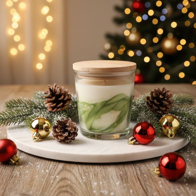 Why You’ll Love the Marbled Glass • Premium frosted vessel with hand-poured marbling • Every candle is truly one-of-one • Elegant holiday aesthetic • Glows beautifully as it burns • Reusable jar for décor or storage • Perfect as a gift or winter décor piece
